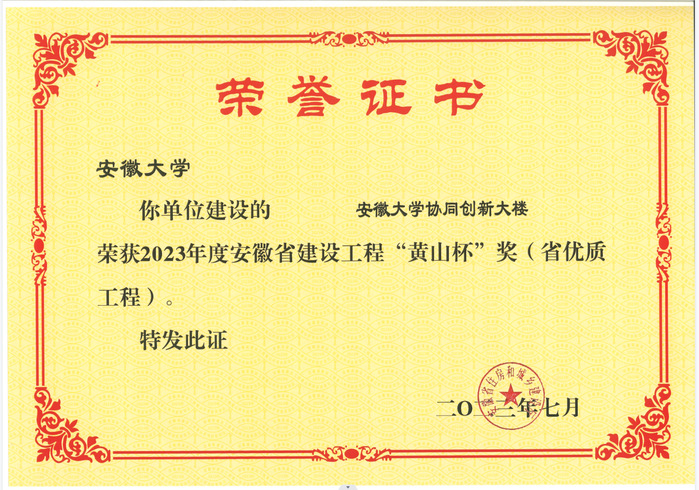 “黄山杯”优质工程奖是安徽省建设工程跨行业、跨专业的最高荣誉奖,每年表彰一次。此次我校协同创新大楼荣获“黄山杯”优质工程奖,标志着工程质量达到了省内领先水平。