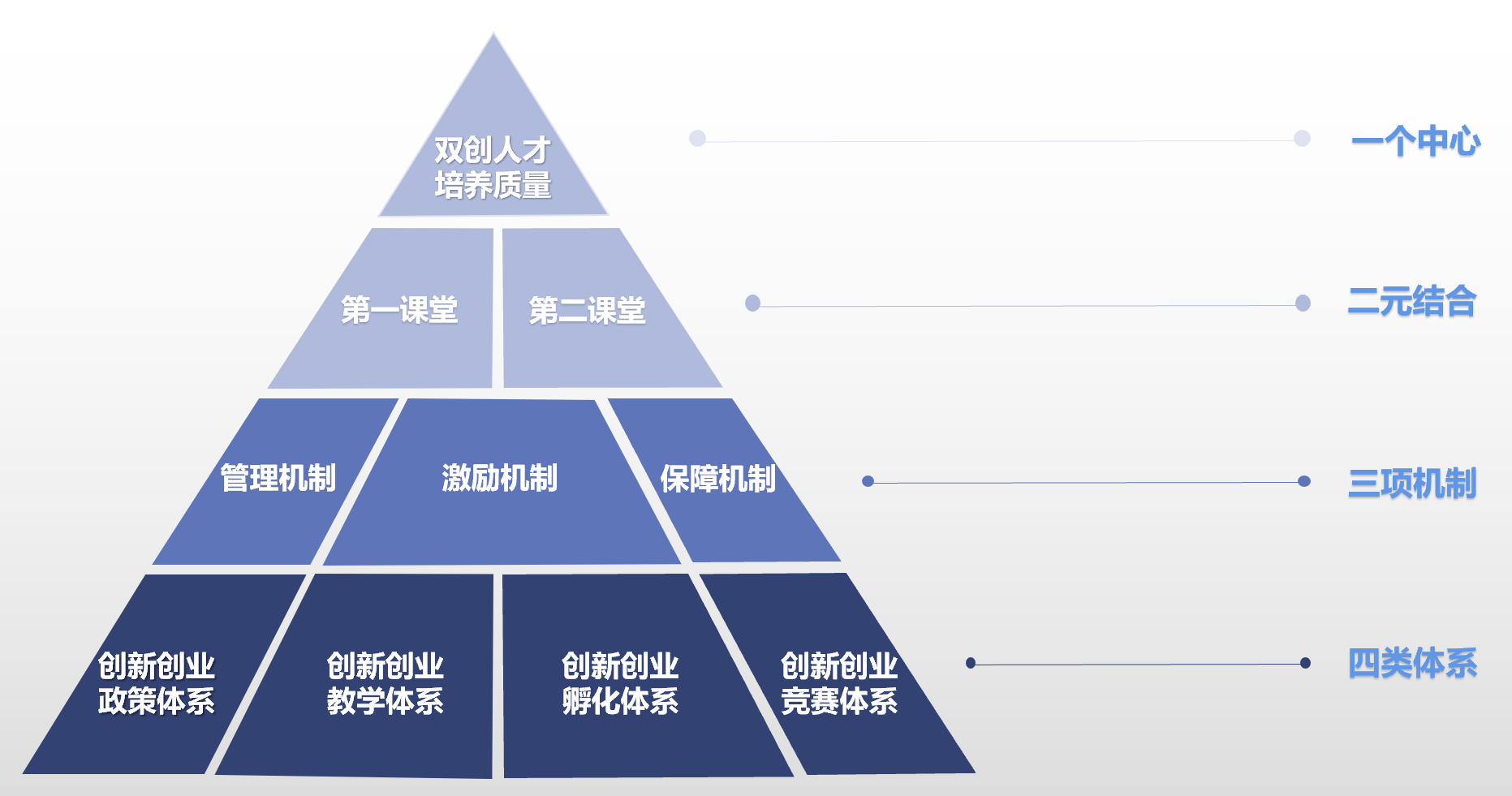 学校党委行政围绕立德树人根本任务,以提高人才培养质量为核心,高度重视以学科竞赛为抓手的双创教育。近年来,学校构建了“1234”双创体系,优化双创机构、修订双创制度、完善奖优体系、打通双创堵点,积极谋划推进“3+X+1”的双创教育框架,打造了由双创政策、双创教学、双创孵化、双创竞赛“四位一体”的双创发展生态。学校双创管理能力、奖优机制、组赛水平、指导热情、参与人数、获奖层次明显提升,学生创新精神、创业意识、创新创业能力获得显著提升,双创教育对于人才培养的支撑更加有力。