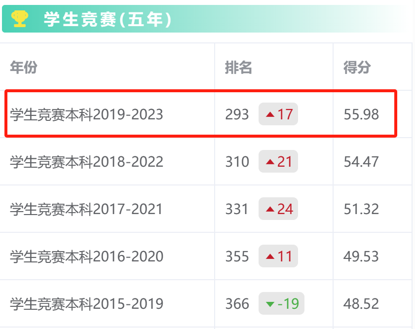 本网讯 近期,高校学生竞赛与教师发展数据平台发布2023年度学科竞赛排行榜单,2019-2023年5年学科竞赛综合排名首次进入了TOP300,位列全国293位,较2015-2019年上一个5年提升了73位,其中2023年单年度竞赛排名提升至215位,较2022年提升75位。学校学科竞赛综合实力得到了显著提升。