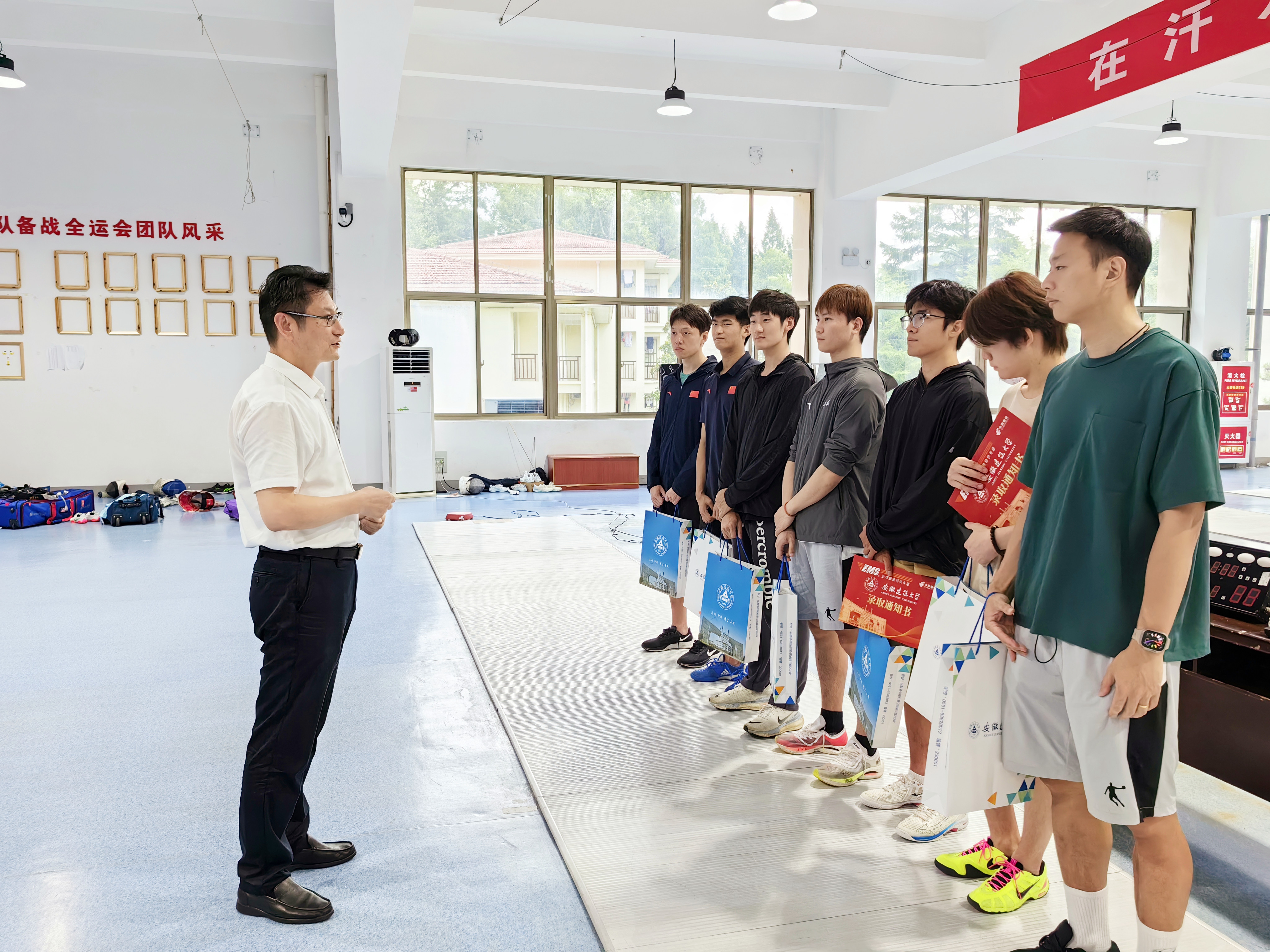 本网讯 8月6日,校党委书记马文革率校办公室、教务处、体育部负责人,赴安庆市岳西县石关国家体育训练基地,看望我校高水平运动队员和校友,为2024级新生代表颁发录取通知书。