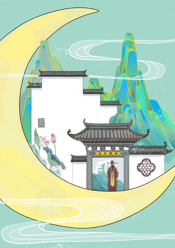 本作品以安徽文化名人包拯和徽派建筑为创作元素,寓意传统文化中的廉洁风尚在新时代的安徽熠熠生辉。