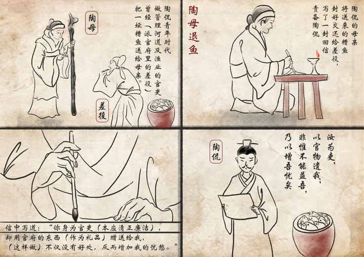 本作品出自《世说新语》陶母退鱼责子的故事,说明领导干部的家属能否抵制各种不正之风,保持清廉风尚,是领导干部能否保持廉洁的一个重要因素。(作者:陈旭;审稿:张兆许)