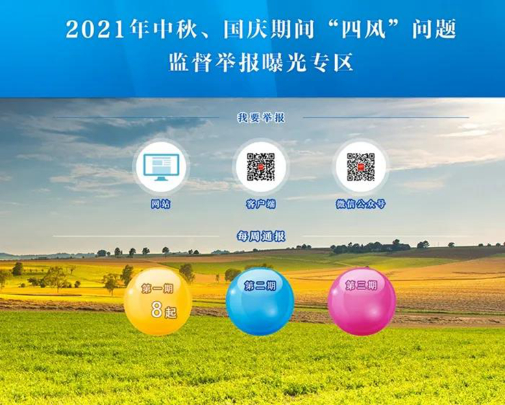 为锲而不舍落实中央八项规定及其实施细则精神,中央纪委国家监委网站推出“中秋、国庆期间‘四风’问题监督举报曝光专区”,畅通监督渠道,加大典型案例通报曝光力度,增强警示震慑和教育引导作用。专区开设“我要举报”窗口,链接中央纪委国家监委统一举报平台,欢迎网友通过网站、手机客户端和微信公众号对节日期间违规吃喝送礼等问题进行举报。专区“每周通报”栏目将从9月22日起,分3次集中对各地查处的“四风”典型问题点名道姓通报曝光,以风清气正的节日氛围助力构建清正廉洁的政治生态。