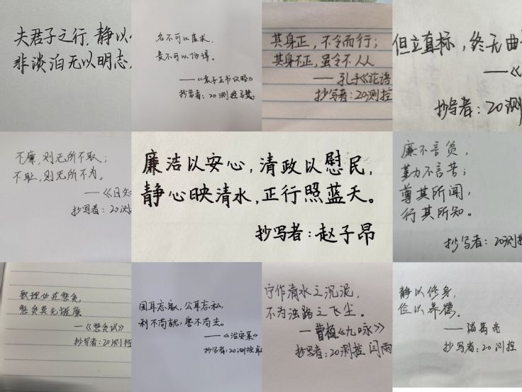 清廉之风徐徐入怀,廉洁文化浸润人心。为大力弘扬中华民族优秀廉洁文化,教育引导学生党员树立正确的价值观。测控专业学生党支部开展“书廉洁警句∙悟清廉文化”廉言警语摘抄活动,党员们认真搜集廉洁警句,一笔一划用心书写“廉”字,在潜移默化中陶冶道德情操,传递廉荣贪耻观念,营造人人思廉、人人倡廉、人人践廉的良好氛围。