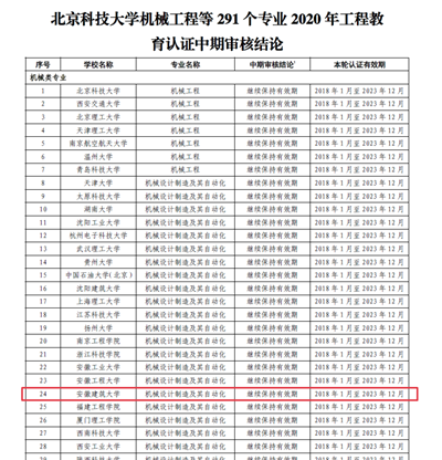 本网讯 20216月11日中国工程教育专业认证协会下发了《关于公布北京科技大学机械工程等291个专业工程教育认证中期审核结论的通知》,公布了2020年全国工程教育认证中期审核结论,我校机械设计制造及其自动化专业顺利通过了工程认证中期审核,有效期至2023年12月。