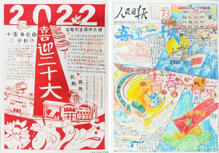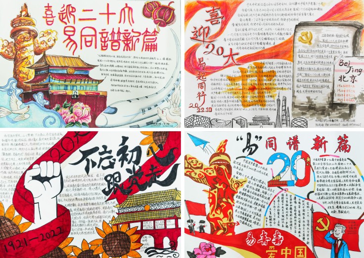 大江流日夜,慷慨歌未央,历史长河滚滚向前,时代号角催人奋进。为了引导学生不断增强民族自尊心、自信心和自豪感,唱响爱党、爱国、爱社会主义的时代主旋律,机电学院举办了“易”同谱新篇——手抄报设计大赛。机电学子积极响应,将学习二十大报告的心得体会,借助手中的画笔绘制成了一幅幅版面精美、内容丰富、布局新颖、书写清晰的手抄报作品。庄严神圣的党旗,鲜艳的五星红旗,飞跃的高铁桥梁,林立的高楼大厦,浩渺的海底隧道……学生们用心绘画,以笔传情,抒发爱党爱国的真挚情感。