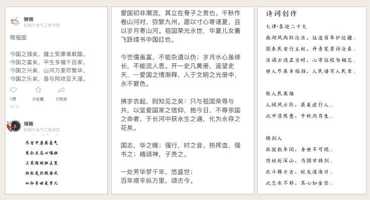 党旗飘飘,忆百年峥嵘;九州秀丽,歌盛世华章。为进一步彰显时代主题,展现青年大学生昂扬向上的精神风貌,机电学院举办“易”同游诗海——诗歌创作比赛,鼓励学生吟诗颂党,以青春之笔、信仰之光,书写清澈挚爱,献礼盛世中华,憧憬明天辉煌。机电学子们踊跃参加,以诗寄情,在诗歌的海洋里畅谈祖国从贫穷落后到繁荣富强的奋斗历程,赞扬从炮火连天到国泰民安的华丽蜕变。机电学子们以诗言志,铭记“昨天”苦难,无愧“今天”的使命,不负“明天”的梦想,诠释对党的忠诚,对祖国的热爱。正如诗歌创作比赛一等奖的22级电气专业贺甲鑫同学在获奖感言中谈到的那样,“时代向前,吾辈向上,脚步铿锵,我们要以实现中华民族伟大复兴为己任,增强做中国人的志气、骨气和底气,不负时代,不负韶华,不负党和人民的殷切期望!”