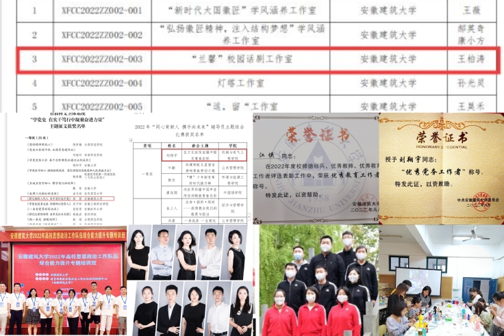 申报国家级学风涵养工作室1项,校级党建课题立项1项。1人在“学党史 在实干笃行中凝聚奋进力量”主题征文比赛中获安徽省一等奖,2人获校三等奖,1人在学校教师硬笔字及粉笔板书比赛中获校二等奖,在“同心育新人携手向未来”辅导员主题班会比赛中获一等奖1人、二等奖1人,3人申报讲师均获评,1人获评大创项目优秀指导教师,1获校“优秀工会干部”,1获校“优秀党务工作者”,1人获校“优秀教育工作者”,队伍建设取得扎实成效。