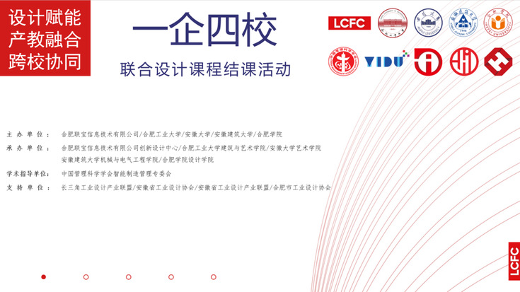 本次一企四校联合设计课程旨在深化产教融合,促进产业创新,推动人才培养供给侧和产业需求侧结构要素全方位融合,安徽省四所高校工业设计、产品设计专业与联宝科技工业设计团队携手合作,在中国管理科学学会的指导下,开展联合设计课程。此次课程获得了来自长三角工业设计产业联盟、安徽省工业设计协会、安徽省工业设计产业联盟、合肥市工业设计协会以及合肥市工业设计协会产业创新专委会的大力支持。