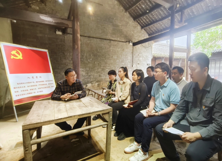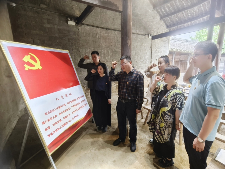 为了加强苏区党的领导和根据地建设,适应新的反“围剿”斗争,根据鄂豫皖省委指示,1932年于金寨县汤家汇镇建立豫东南道委、道区苏维埃政府。随着革命政权日益巩固,苏区范围逐渐扩大,革命烽火燃遍整个大别山区,为中国革命的胜利奠定了坚实基础。活动现场,全体党员怀着崇敬之情,怀着对党的无限忠诚,在这座见证了革命岁月的历史建筑里感受党的光荣历程,铭记党的初心和使命。黄磊带领大家面对党旗、高举右手,重温入党誓词。