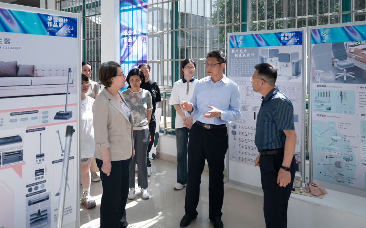 在学院党政陪同下,马文革详细了解与联宝科技、长虹美菱、合力叉车、江淮汽车等国家级工业设计中心联合毕业设计作品的创作过程和应用情况,并与指导教师、学生亲切交流、互动,询问学生的就业情况,对这些创意新颖、形式多样,融合科技、市场需求与艺术的作品表示赞赏。