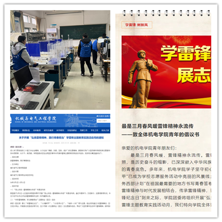 此次活动是学雷锋主题教育实践活动月的重要一环,在3月间,机电学院围绕“弘扬雷锋精神,践行青春担当”的活动主题,精心谋划了“我心向党--雷锋精神永传颂”专题读书班、“传承雷锋精神,牢记青春使命”主题班会(团日)活动、“我为同学办实事,文明美丽校园行”志愿服务活动、“寻找Z世代的雷锋精神”主题征文活动等六大实践活动模块,并向全院青年发布《最是三月春风暖 雷锋精神永流传——致全体机电学院青年的倡议书》鼓励和引导学院广大团员青年积极投身志愿服务事业,在志愿服务中受教育、长才干、做贡献(文:王柏涛一审:刘翔宇;二审:何鹤立;三审:叶少宝