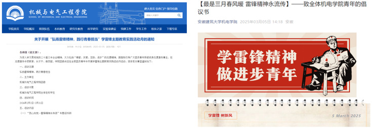 本网讯   为深入学习习近平总书记关于弘扬雷锋精神的重要论述,鼓励广大青年学子投身志愿服务事业,机电学院自发布《最是三月春风暖雷锋精神永流传——致全体机电学院青年的倡议书》以来,以“弘扬雷锋精神,践行青春担当”为主题,围绕六大模块开展各类学雷锋主题教育实践活动40余场。学院全体在校生积极响应,主动参与,以实际行动践行雷锋精神。