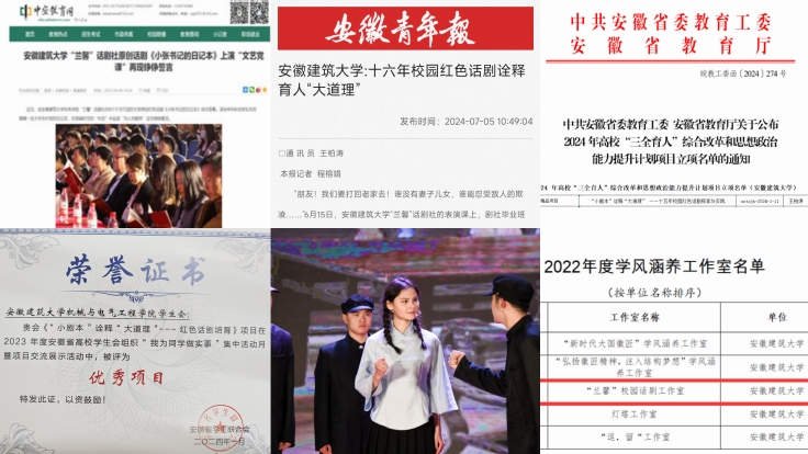 打磨品牌项目,助力青年成长成才。学院团委立足“以文化人,以德润心,科学与人文共融,创新与传承并存”的育人思路,依托“兰馨”话剧社,十六年薪火传承,不断擦亮“话剧节”特色活动品牌。剧社深入挖掘红色资源,打造“青年解读、青年演绎、青年影响”的党史宣讲模式,用红色话剧“小舞台”搭建思政“大课堂”,为大学文化注入新内涵、为美育工作增加新层次、为思政教育提升新境界。2022年“兰馨”话剧社获评中国科协国家级“学风涵养工作室”;2024年“话剧节”获评安徽省学联“我为同学做实事”优秀项目并被《安徽青年报》报道;红色话剧《青春的选择》被“学习强国”报道;《“小剧本”诠释“大道理”——十五年校园红色话剧探索与实践》获安徽省“三全育人”综合改革和思想政治能力提升计划项目高校思想政治工作精品项目立项;剧社指导教师团队多人获得全国优秀易班辅导员、校“三全育人”先进个人、优秀共产党员、优秀党务工作者、新闻宣传先进个人等称号。