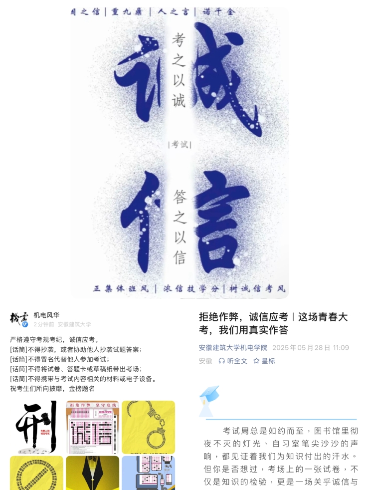 学院充分发挥新媒体平台传播优势,在学院公众号和易班平台同步发起诚信考试主题宣传活动。公众号推出“拒绝作弊,诚信应考”推文,通过漫画图解的形式生动解读考试纪律要点,易班平台在“机电早班车”推出诚信考试提醒贴,进一步扩大诚信考试教育的覆盖面和影响力,在全院上下营造出人人讲诚信、人人守考纪的浓厚氛围。