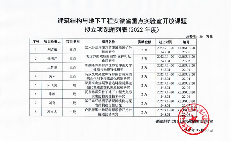建筑结构与地下工程安徽省重点实验室 2022年度开放课题拟立项课题的通知