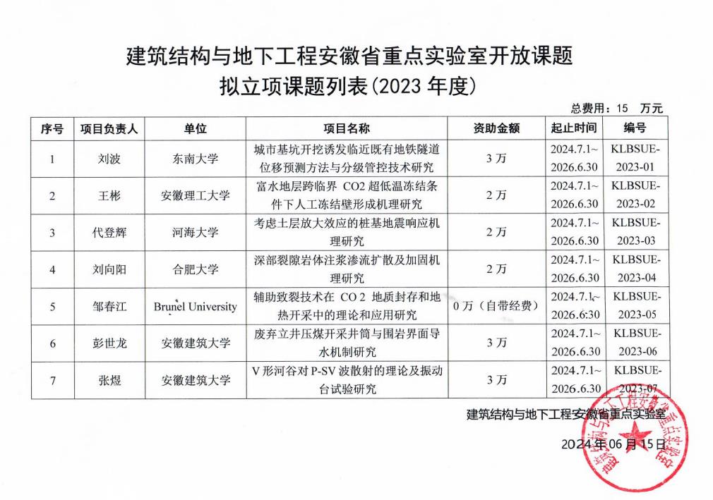 附表-建筑结构与地下工程安徽省重点实验室开放课题(主任基金)拟立项课题列表