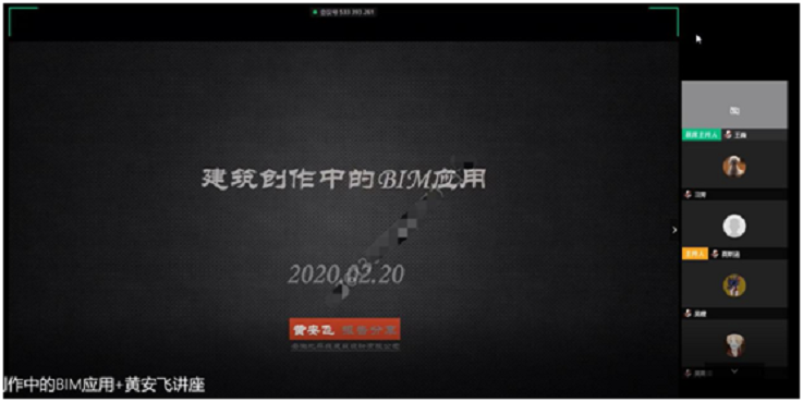 本网讯   220日,安徽地平线建筑设计有限公司BIM研发中心总监、第二工作室负责人,安徽省第三届“青年建筑师奖”获奖者,安徽省土木建筑学会副秘书长黄安飞应学院邀请,通过网络平台为全院师生带来“建筑创作中的BIM应用”的专题讲座,学院教师和百余名同学参加,副院长王薇主持本次讲座。