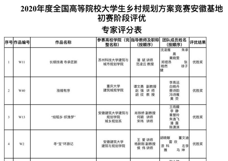 本网讯 近日,2020年度全国高等院校大学生乡村规划方案竞赛(安徽基地)初赛获奖名单公布,建筑与规划学院规划系获得“两优”,“四佳”好成绩;(各基地初期评优只评选优胜奖和佳作奖,本次安徽基地第一单元共计18个高校,35个团队,共计194名学生参加竞赛,选出9份优胜奖作品,参与全国竞赛一、二、三等奖的评优)。其中肖铁桥、何颖、宋祎老师指导的17级城乡规划专业王雨朦等6位同学,提交的《“绘稻香,织渔梦”》作品,和王爱、杨新刚、侯伟老师指导的17级城乡规划专业胡晓敏等6位同学,提交的《寻“宝”环游记》作品都获得了优胜奖,后期将参与全国的竞赛评优。
