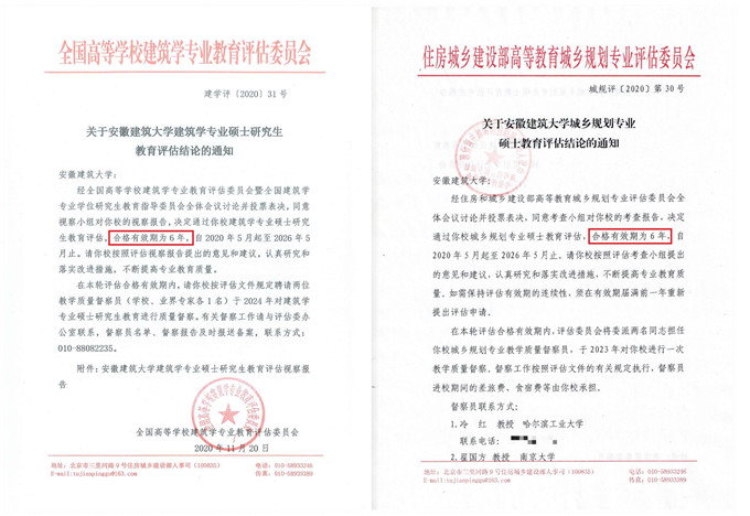 本网讯 近日,全国高等学校建筑学专业教育评估委员会和住建部高等教育城乡规划专业评估委员分别召开全体会议,经全体会议集体研究、投票决定,我校建筑学和城乡规划专业硕士教育通过复评,有效期均为6年(2020年5月至2026年5月)。建筑学、城乡规划专业硕士教育评估取得了“双优秀”。