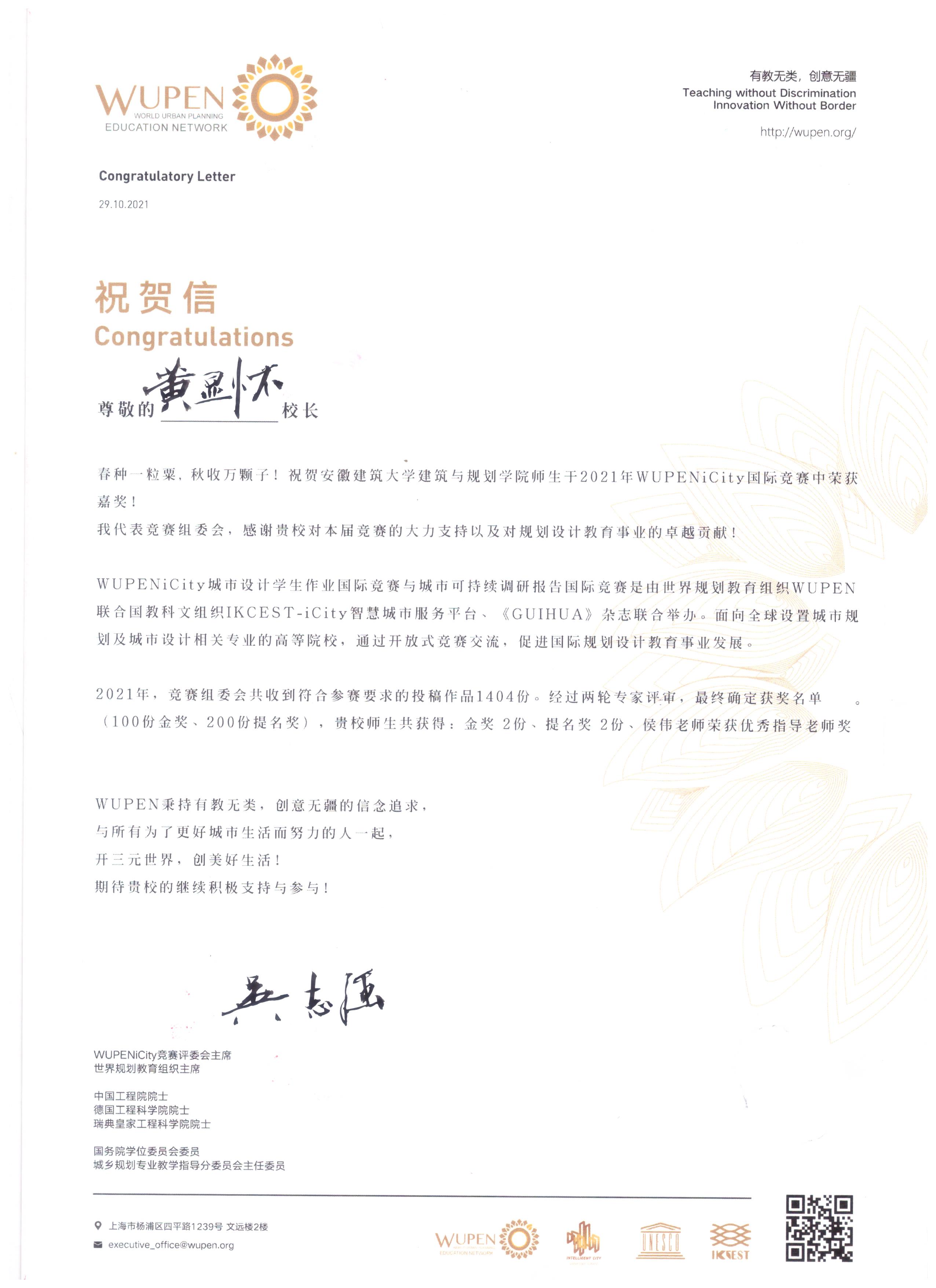 本网讯 11月18日建筑与规划学院收到WUPENiCity竞赛组委会寄来的获奖证书,组委会感谢学校对竞赛的大力支持和对规划教育事业的卓越贡献,嘉奖了我院师生在“WUPENiCity2021城市设计及2021城市可持续调研报告竞赛”优异成绩,其中我院侯伟老师获优秀指导老师。