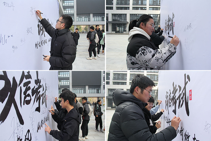 在实训综合楼中庭诚信考试主题签名墙上,建规学子纷纷自发签名并承诺“树文明考风,从你我做起”。寒风凌冽,但同学们签承诺的心却炙热无比。同学们争相在签名墙上签下自己的姓名,争当诚信考试标兵。