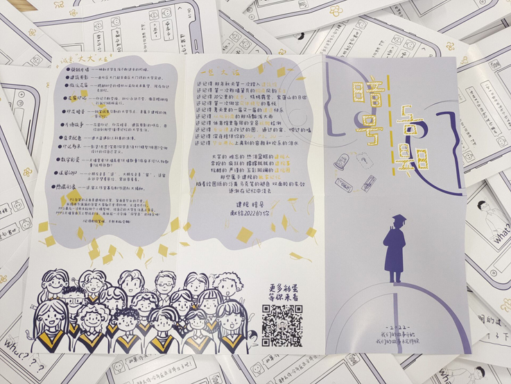 2022届建规学院毕业礼物是“印花暗号”模型摆件。从北区报到、皖南写生、60里毅行、模型搭建、实体建造、乔迁校区、疫情防控、专业学习、电脑绘图、毕业离校,用钢笔线条勾勒出属于建规的独家记忆。旋转的片墙映射求学生涯不断进步的阶梯,永恒的印记是徽匠永远不变的初心,建筑的剪影留下大学的足迹,徽派的花窗是过去、现在、未来跨越时空的情怀,蓝黄的配色是建大蓝遇到工科黄的浪漫,随着绘图纸的泛黄、马克笔的褪色、双面胶的失效,逐渐在记忆中淡去,每一个成长的印记,都献给最好的自己,以梦为马,不负韶华。