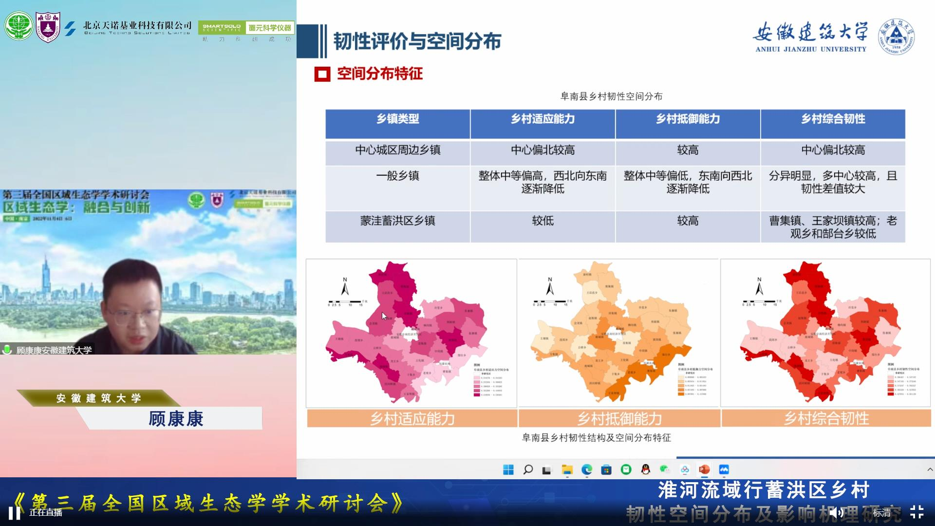 顾康康报告针对淮河流域行蓄洪区的乡村衰败和蓄洪内涝问题展开研究;基于演进韧性理论,重新建构了以乡村抵御力和适应力为主要测度准则的乡村韧性评价体系;分析阜南县2012-2020年乡村韧性空间分布格局,探讨其影响机制,以期未来能够提高乡村的抵御、恢复、更新以及适应能力。