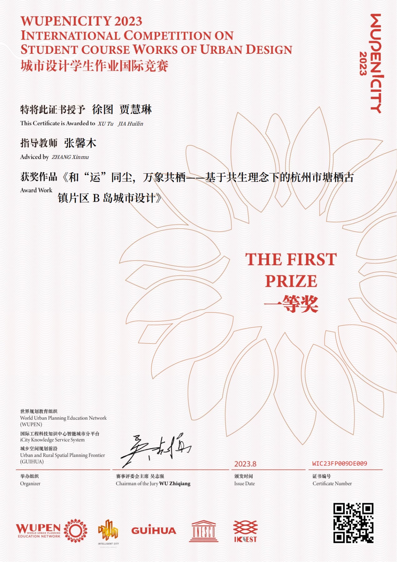 张馨木老师指导的城乡规划专业同学徐图、贾慧琳完成的作品《和“光”同尘,万象共栖——基于共生理念下的杭州市塘栖古镇片区B岛城市设计》在“未来共生家园”城市设计学生作业国际竞赛中荣获一等奖,这是我校目前参加WUPENiCity城市设计学生作业竞赛单元首次取得该项最高奖。在城市可持续调研报告国际竞赛中,由李久林老师指导的城乡规划专业同学徐灵钰、章璎、杨丹和肖星宇完成的作品《大湖气质下的“文”“科”生——合肥市“文里文气”城市气质对科里科气城市品质的促进作用调研》荣获三等奖。