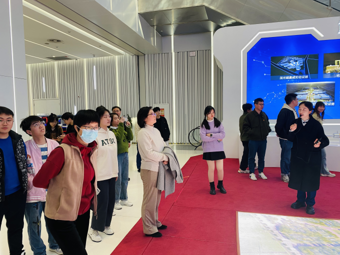 安徽创新馆由三栋独立的场馆组成,馆内充分展示安徽创新发展最新成果、最靓特色、最杰出人才,体现先行示范功能,实现实用平台功能。三大主题场馆以科技成果转化交易为核心,形成“聚集展示、捕捉寻找、研发转化”的环形功能链。2020年8月19日,习近平总书记在安徽创新馆参观考察时指出:“安徽要加快融入长三角一体化发展,实现跨越式发展,关键靠创新。要进一步夯实创新的基础,加快科技成果转化,加快培育新兴产业,锲而不舍、久久为功。”在馆内讲解员的带领下,党员师生们沿着习近平总书记的足迹,学习领悟科技创新的重要性,参观了智慧疫苗接种系统解决方案、VR视觉反馈仿人随动机器人、稳态强磁场等。参观过程中,大家仔细观看,认真听取工作人员讲解,同时借助视频、模型等多媒体手段进行互动体验,近距离感受了高端科研成果的风采。