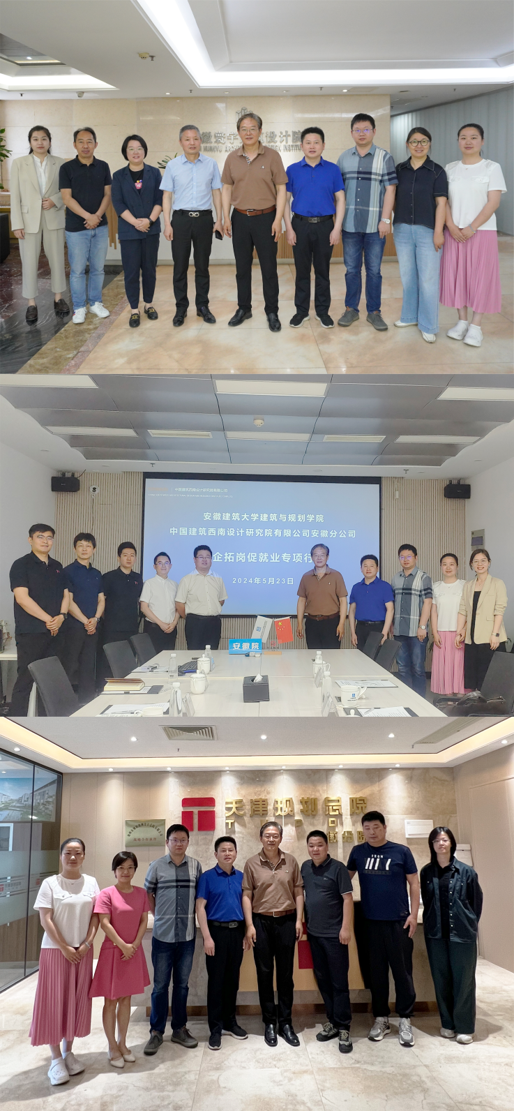 本网讯 为精准拓展就业岗位,持续优化就业指导服务,学院积极开展“访企拓岗”专项行动,促进毕业生高质量充分就业。2024年5月23日,建规学院党委书记唐劲松率学院领导班子成员、教师代表、毕业班辅导员赴中国建筑西南设计研究院有限公司安徽分公司、安徽寰宇建筑设计院、海河集团天津规划总院安徽分公司、安徽敬业规划咨询有限公司开展展访企拓岗活动。