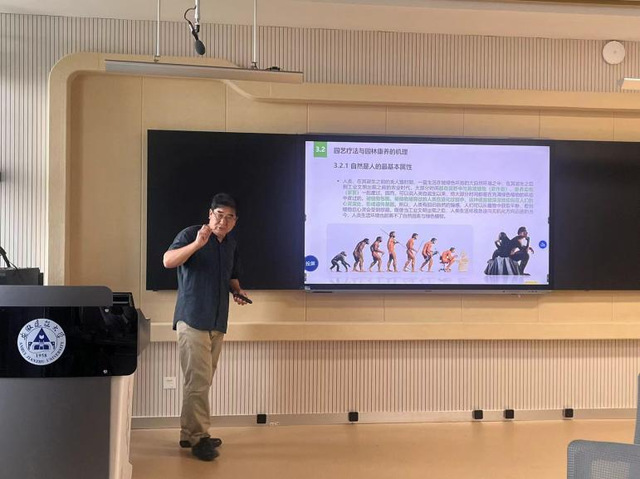 在同学们对园艺疗法和园林康养已有基础认识的前提下,李树华教授引出了绿色医学与绿康城市的提案。通过全面对比西医、中医和绿色医学,他深入解析了绿色医学的优势,并从城市生态和居民健康两个角度出发,将生态城市与健康城市相结合,提出了绿康城市的概念和绿色处方。
