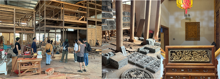 为了进一步了解徽派建筑工艺的精髓,服务团还前往了华阳镇的古建筑雕刻和模型工厂。在这里,学生们亲眼见证了匠人们如何将一块块普通的木材、石材雕刻成栩栩如生、大名鼎鼎的徽州三雕艺术品,也亲身体验了制作古建筑模型的乐趣。通过与工匠师傅的互动学习,大家不仅掌握了徽派建筑雕刻的基本技法,更深刻理解了其背后的文化内涵和艺术价值。这次经历,无疑为服务团后续的乡村文创设计提供了宝贵的灵感和素材。