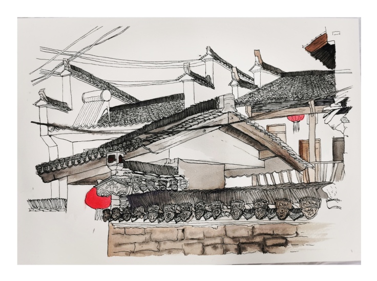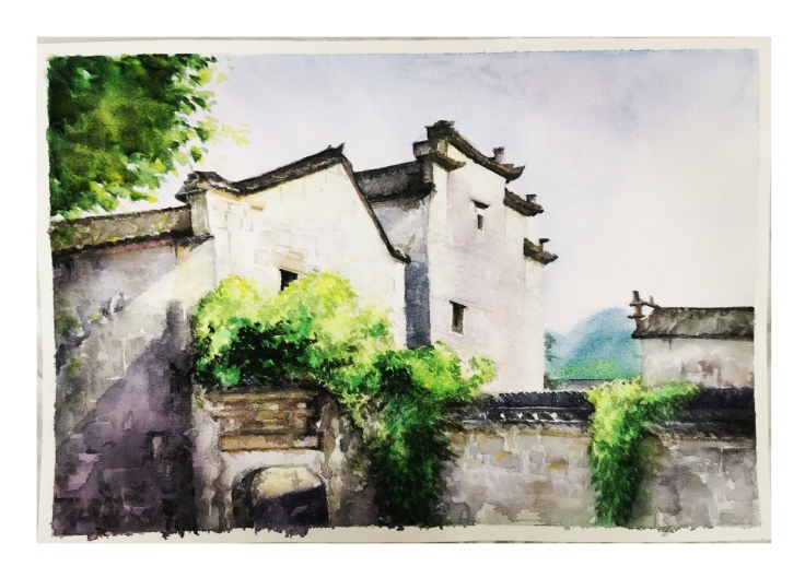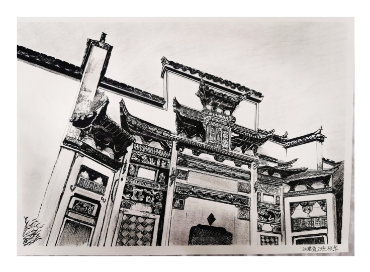 穿行于粉墙夹道的街巷,马头墙起伏的剪影与雕花门楣的纹样,无声讲述着徽州匠人的营建哲思。皖南地区徽派建筑资源丰富,粉墙黛瓦、马头墙、木雕砖雕等元素为写生教学提供了鲜活素材。课程依托古村落实景,引导学生掌握选景构图与画面表现技巧,培养对建筑空间、形态美学的敏锐洞察力,进一步推动徽文化研究与教学创新融合。