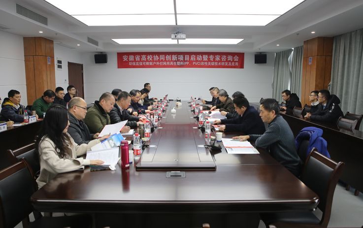 本网讯 118日下午,我校作为牵头单位承担的安徽省高校协同创新项目环保高强可降解户外栏网用再生塑料(PP、PVC)改性关键技术研发及应用启动暨专家咨询会在实验综合楼第三会议室召开。安徽省教育厅科研处一级调研员许绪荣、副校长蔡新立出席会议并致辞,来自中国科学技术大学、合肥工业大学和安徽大学的专家、科技处及材化学院负责人、课题组骨干成员参加了会议。