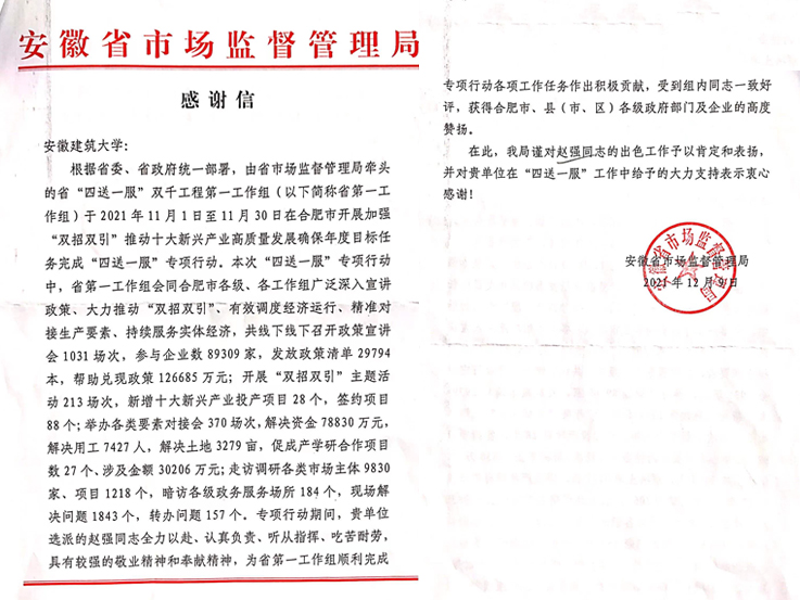 本网讯 近日,安徽省市场监督管理局就我校“四送一服”双千工程工作发来感谢信,对我校给予省“四送一服”第一工作组的支持表示感谢,对我校选派的谢发之、赵强两位同志表示高度认可。他们全力以赴、认真负责、听从指挥、吃苦耐劳,具有较强的敬业精神和奉献精神,为省第一工作组顺利完成专项行动各项工作任务做出积极贡献,受到组内同志一致好评,获得合肥市、县(市、区)各级政府部门及企业的高度赞扬,工作组为此向学校发来感谢信。
