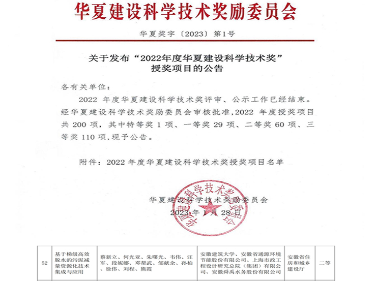 “华夏建设科学技术奖”是建设系统以社会力量办奖形式设立的建设行业科学技术奖,旨在奖励在建设行业工作中有重要贡献的组织和公民,促进科技成果向生产力转化,提升住房和城乡建设行业的综合技术水平。2022年度授奖项目共200项,其中特等奖1项、一等奖29项、二等奖60项、三等奖110项。