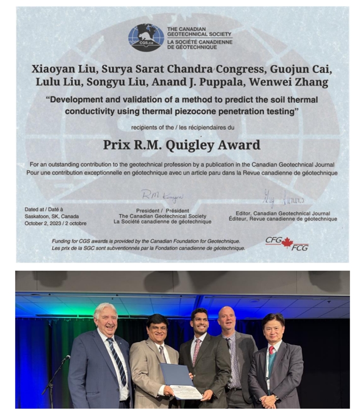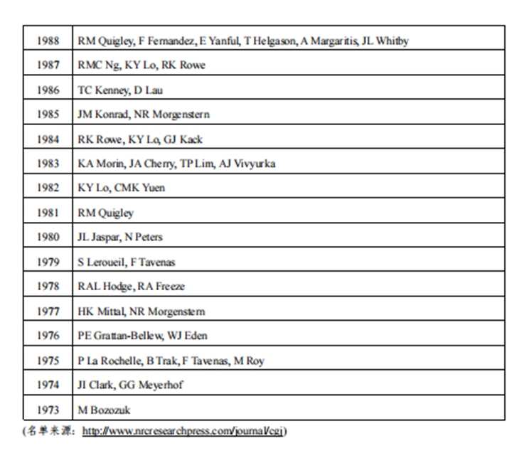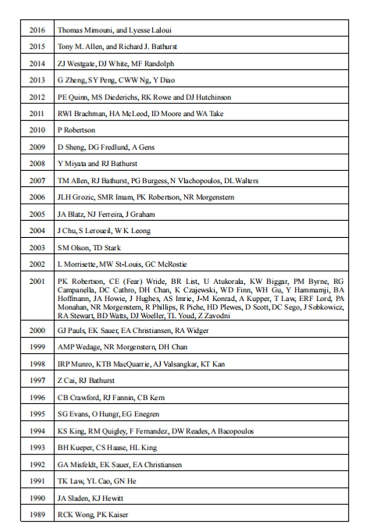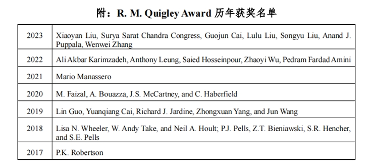 该奖设立于1973年,原名“加拿大岩土工程学会奖”,1995年更名为R.M.Quigley Award”,以纪念R. M. Quigley博士(1934-1995)在岩土工程和地质环境领域做出的杰出贡献。该奖旨在表彰前一年度在《Canadian Geotechnical Journal》(国际三大权威岩土期刊之一)上发表的最佳论文(全球每年仅1篇)。(文/图:聂利青;审核:王媛)