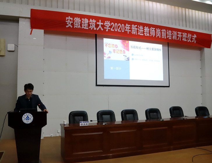 成祖德首先代表学校对新进教师表示热烈欢迎,并对学校当前正处在进一步上层次、上水平关键时期情况作简单介绍,他从加强学校教师队伍建设、增强师德师风建设的角度,着重强调学校开展新进教师岗前培训的重要意义。他号召全体新进教师珍惜这次培训机会,以饱满的热情和高度的责任感投入学习,做到学有所获、学有所得、学有所成,并对参训人员提出三点希望:一要端正学习态度,确保达到培训目的与要求;二要认真学习思考,在参加培训的过程中学会联系自身与工作实际,带着问题思考学习,争取融会贯通、知行合一;三要遵守纪律规定,严格按照相关规定履行请假手续,妥善处理各方关系,争取学习、工作两不误。最后,他预祝2020年岗前培训圆满完成,祝福各位新进教师能以新的面貌、新的状态迎接新的工作。