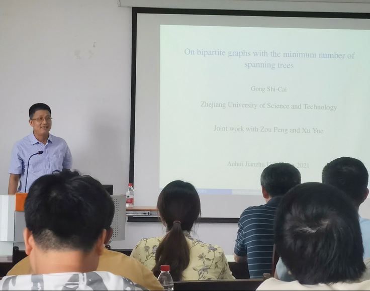 数理学院院长戈慈水首先对范益政院长、汪毅副院长和龚世才教授莅临我校指导工作,表示热烈地欢迎,并对三位老师进行了简短地介绍。接着,浙江科技学院的龚世才教授作了题为“On bipartite graphs with the minimum number of spanning trees”的学术报告,分享了自己最新的研究成果以及研究过程中的心路历程,并提出了若干可以进一步研究的问题。