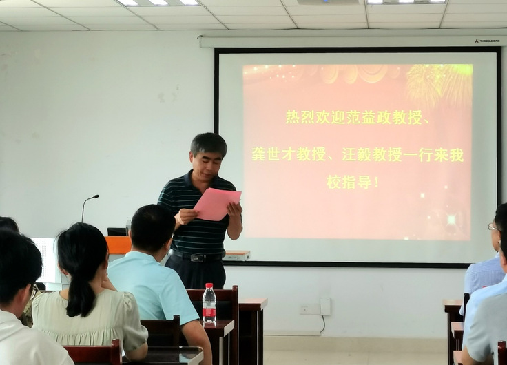 本网讯 为了进一步加强学院研究生的学术水平,提高人才培养质量,7月22日,安徽大学数学科学学院院长范益政教授、副院长汪毅教授,以及浙江科技学院应用数学学科带头人龚世才教授应邀来我校进行科研指导与交流。数理学院院长戈慈水、部分教师及研究生共约30人,参加了此次交流活动。