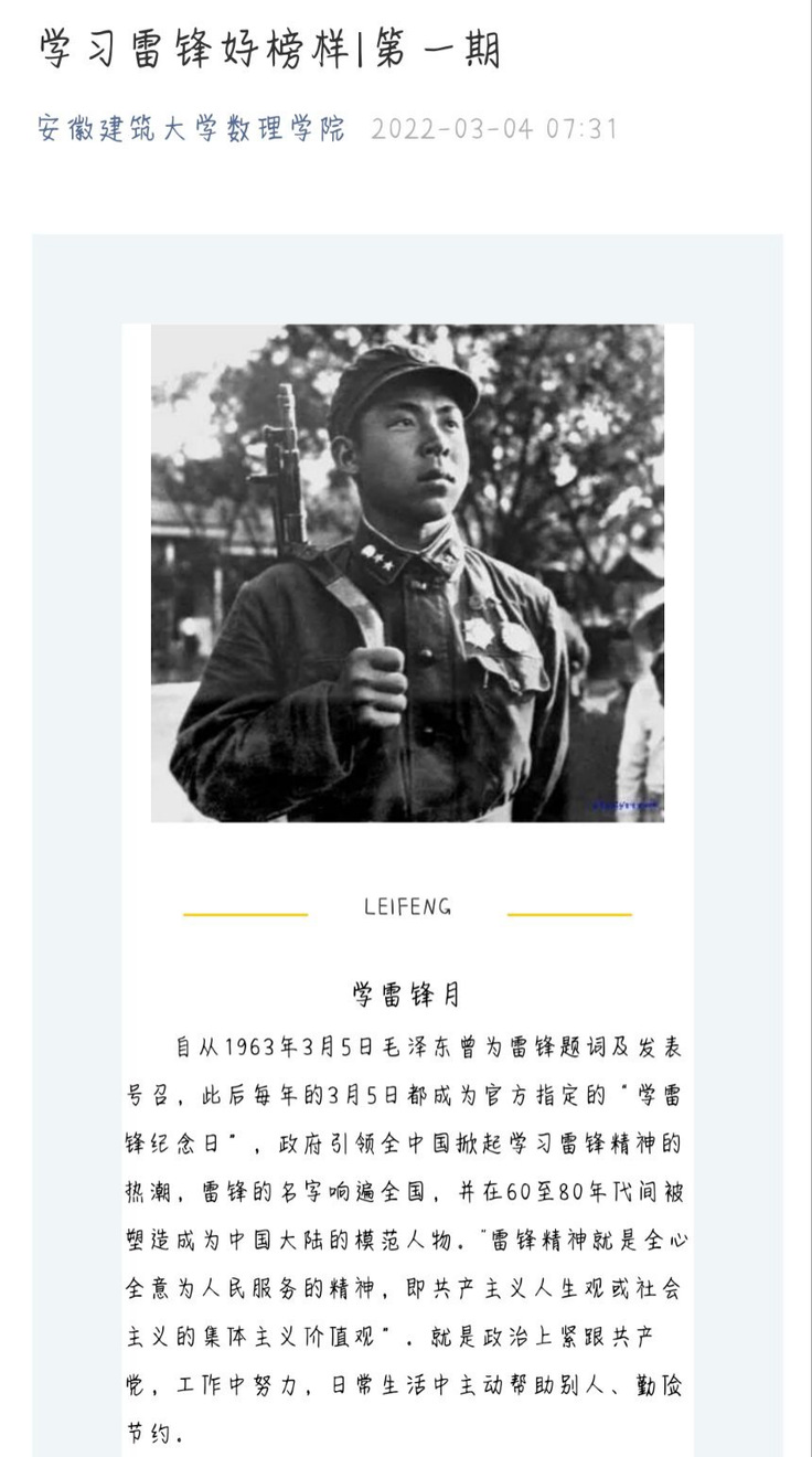 3月初,学院易班公众号在线上开展“学雷锋好榜样”主题宣传活动,号召学院全体师生一起向雷锋学习,用实际行动促进团结友爱、见义勇为的良好社会风气,从自己做起,从身边的小事做起,让“学雷锋”活动渗透到日常生活中,使其成为我们生活的一部分,让其精神磨砺我们形成无私奉献的高尚品格。