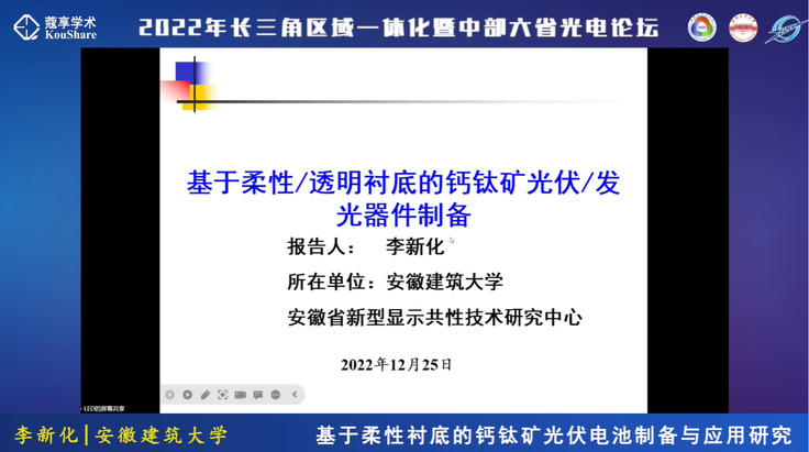 我校安徽省新型显示共性技术研究中心组织科研骨干邓燕教授、赵强教授、李新化研究员和张东徽博士参加此次会议学术交流,我校李新化研究员应邀做题为“基于柔性/透明衬底的钙钛矿光伏/发光器件制备”的学术报告,报告引起参会专家学者热烈讨论,研究成果获得了与会专家的一致好评。作者:李新化;审稿:戈慈水 赵强