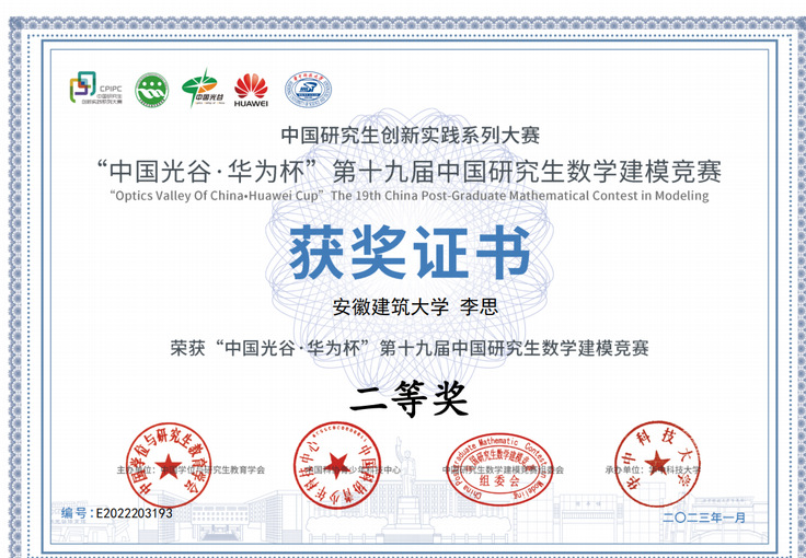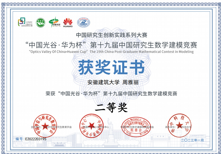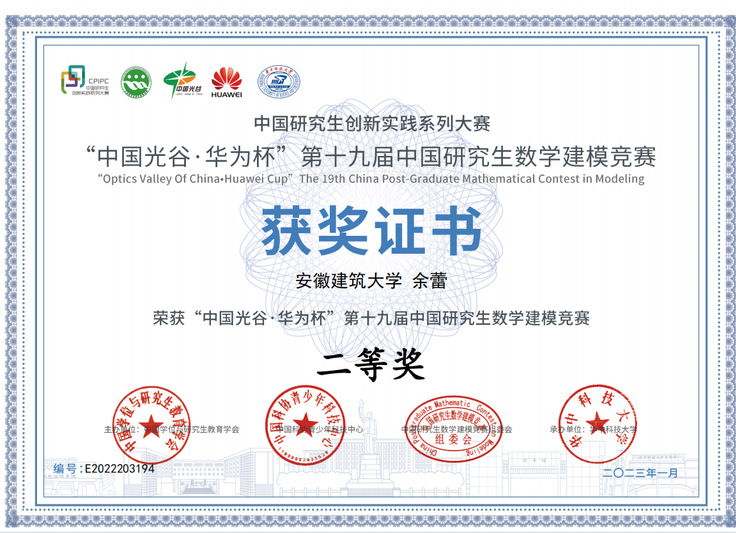 本网讯 2022年“中国光谷Ÿ华为杯”第十九届中国研究生数学建模竞赛结果于近日揭晓,我校共有26支队伍参赛,其中荣获全国二等奖1项,三等奖2项。本次大赛共吸引国内外共465个研究生培养单位的17970队研究生参赛,一等奖获奖比例仅为1.10%,二等奖获奖比例为13.36%,三等奖获奖比例18.58%,总获奖比例33.03%。