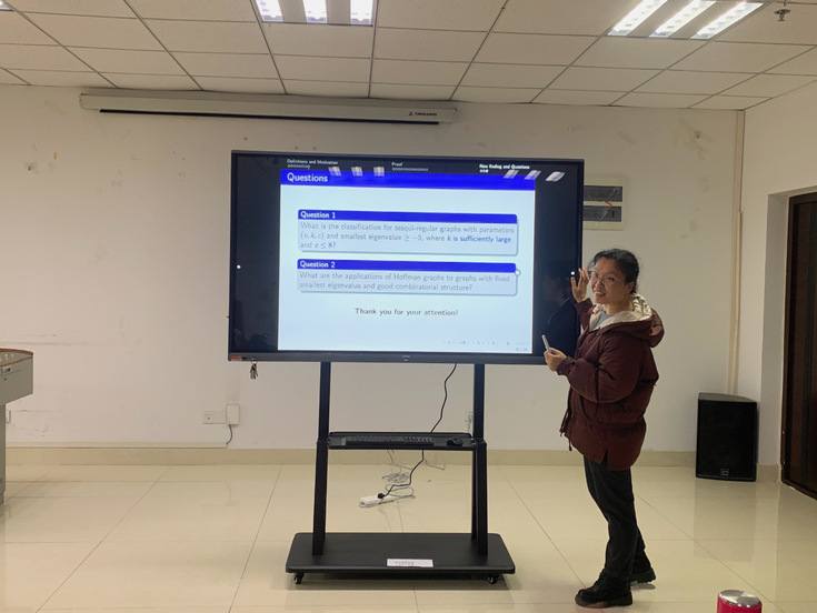 本网讯 2023年3月23日下午3时,上海大学杨倩倩讲师应我院图与组合课题组邀请在实验综合楼1311室做了题为“The recent progress on sesqui-regular graphs with fixed smallest eigenvalue”的学术报告。报告会由统计系主任谭莹莹教授主持。中国科学技术大学Jack Koolen教授、熊彦禛和Brhane Gebremichel博士后、安徽大学徐静和李双东老师、我院图与组合方向的老师和研究生们聆听了本次报告会。
