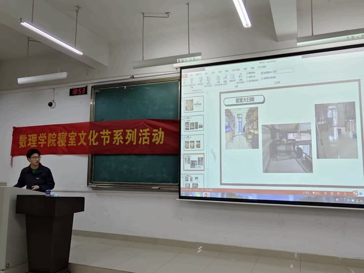 本次活动共推选出11间寝室以图片和视频形式进行现场评选。活动开始,首先由主持人介绍本次活动评选标准和活动评委,然后由各寝室代表依次上台讲解和展示。各个参选寝室都具有自己的独特亮点,展示出当代大学生的活力以及寝室的凝聚力。最终经过现场评委的投票结果,选出14#101和11#507寝室为本次“吉尼斯寝室”的一等奖。
