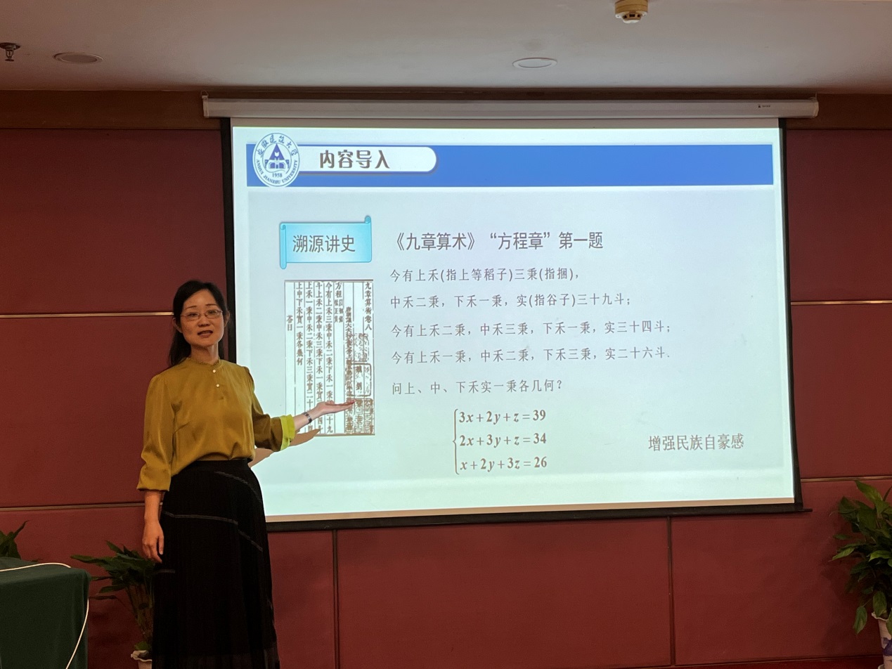 28日下午,分教研、科研和中学组3个分会场进行。在教研分会场,我院李璐老师受邀代表学校作了题为《线性代数课程创新》的教学类专题报告,全面展示了《线性代数》课程的教学理念、多元融合的教学内容、新颖的教学设计和全方位的教学评价以及取得的教学成果,报告内容获得参会教师的一致好评。
