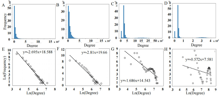 1 融合网络的连接度直方图与对应幂律曲线