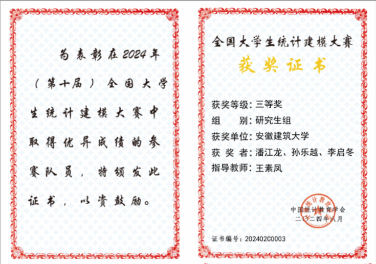 本网讯 2024年(第十届)全国大学生统计建模大赛国赛获奖名单于8月26日公布。我校学子-潘江龙、孙乐越和李启冬的参赛作品《国家创新型城市试点能否助推绿色技术创新的“量质齐升”》荣获国家三等奖。此外我校有11组研究生成功获奖,分别获得赛区一等奖2组,赛区二等奖3组,赛区三等奖6组;有4组本科生获奖,分别摘得安徽省赛区二等奖1组,安徽省赛区三等奖3组。