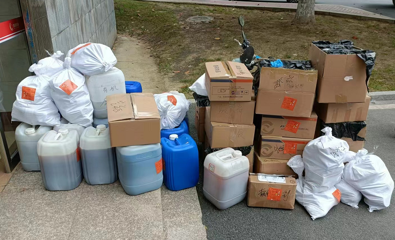 本次实验室化学品废弃物回收处置从收储、申报到分装、清运历时两周,共处置环境与能源工程学院、材料与化学工程学院等实验室收集的废液、废固、过期化学品、试剂空瓶等废弃物1.579吨。